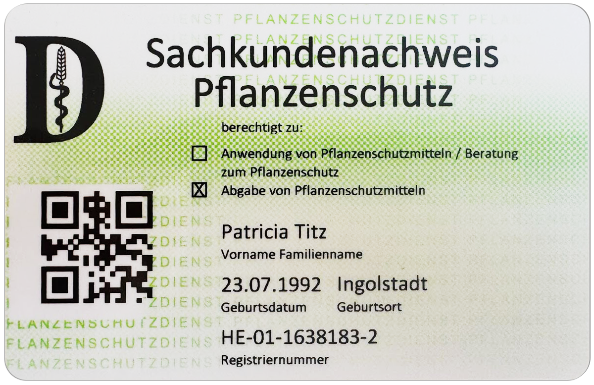 Sie hat an die Sachkunde im Pflanzenschutz gemäß § 9 Abs. 4 Pflanzenschutzgesetz (PflSchG) und auch an Fortbildungen gemäß Chemikalienverbotsverordnung und ChemBiozidDV teilgenommen.