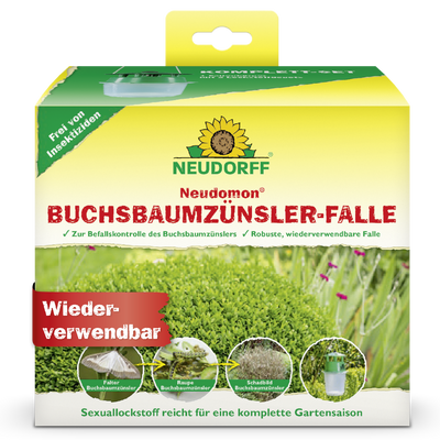 Dzięki pułapce na mole bukszpanowe Neudorff Neudomon możesz skutecznie chronić swoje cenne bukszpany przed strasznymi uszkodzeniami liści. Ta sprytna pułapka feromonowa służy do niezawodnej kontroli inwazji i pomaga określić optymalny czas na podjęcie dalszych działań. Wysoce specyficzny atraktor seksualny przyciąga tylko samce ćmy bukszpanowej. Uniemożliwia to krycie i znacznie zmniejsza liczbę szkodliwych gąsienic. Pułapka nie wymaga stosowania środków owadobójczych i nie przyciąga pszczół. Jeden zestaw wystarcza na ogród o powierzchni do 200 metrów kwadratowych i dzięki dwóm magazynom atraktantów wystarcza na cały sezon ogrodowy od kwietnia do września. Dzięki solidnej konstrukcji pułapkę można używać wielokrotnie przez lata i po prostu napełnić ją opakowaniem uzupełniającym. Oznacza to, że zawsze możesz obserwować lot motyla i w razie potrzeby zareagować w odpowiednim czasie, zanim żarłoczne gąsienice wyrządzą ogromne szkody Twoim roślinom.